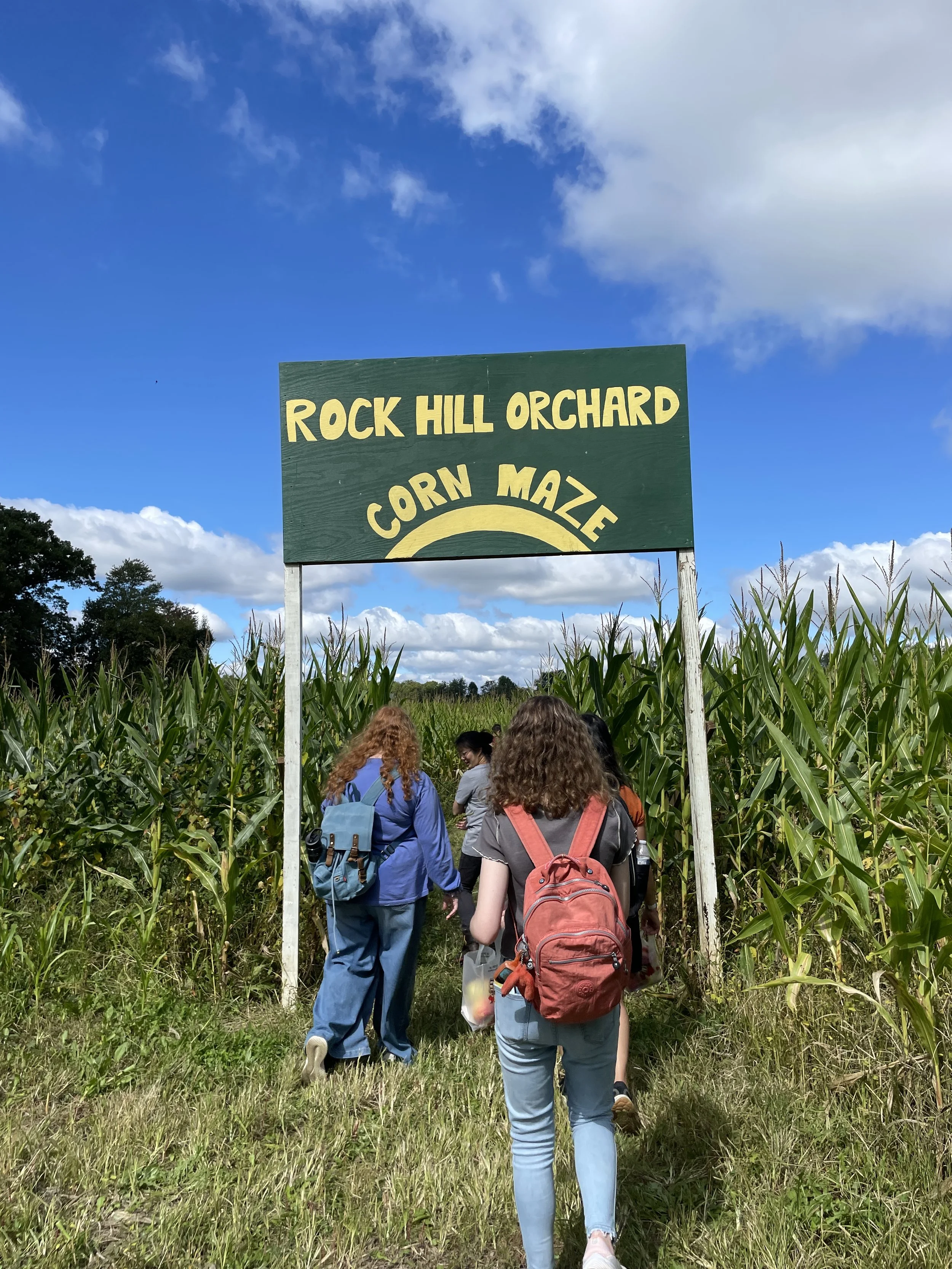Group of people walking through a corn maze at Rock Hill Orchard on a sunny day with blue sky and clouds.