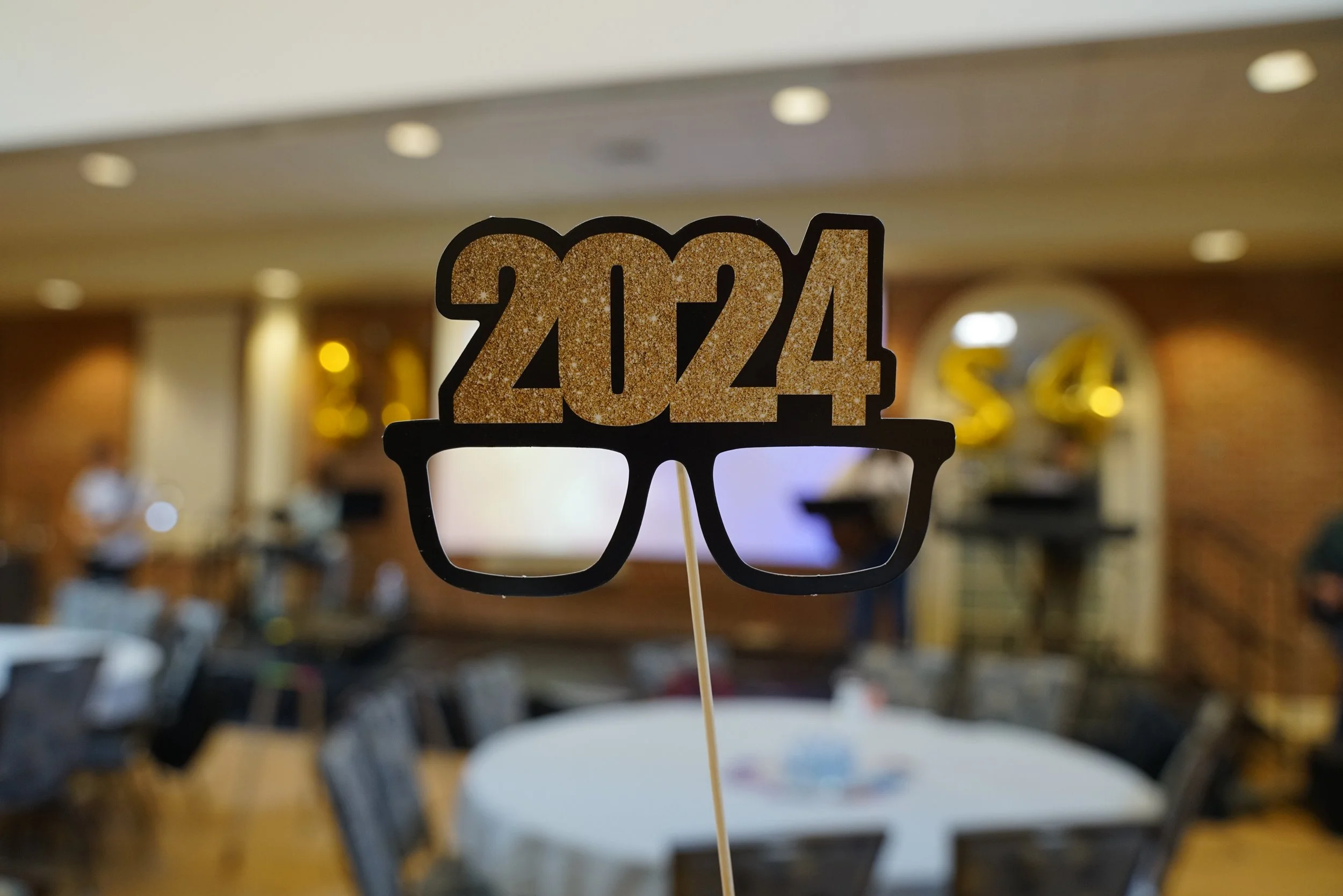 A decorative sign with the year 2024 in gold glitter, shaped like glasses, in focus in a blurred indoor setting with tables, chairs, and balloons in the background.