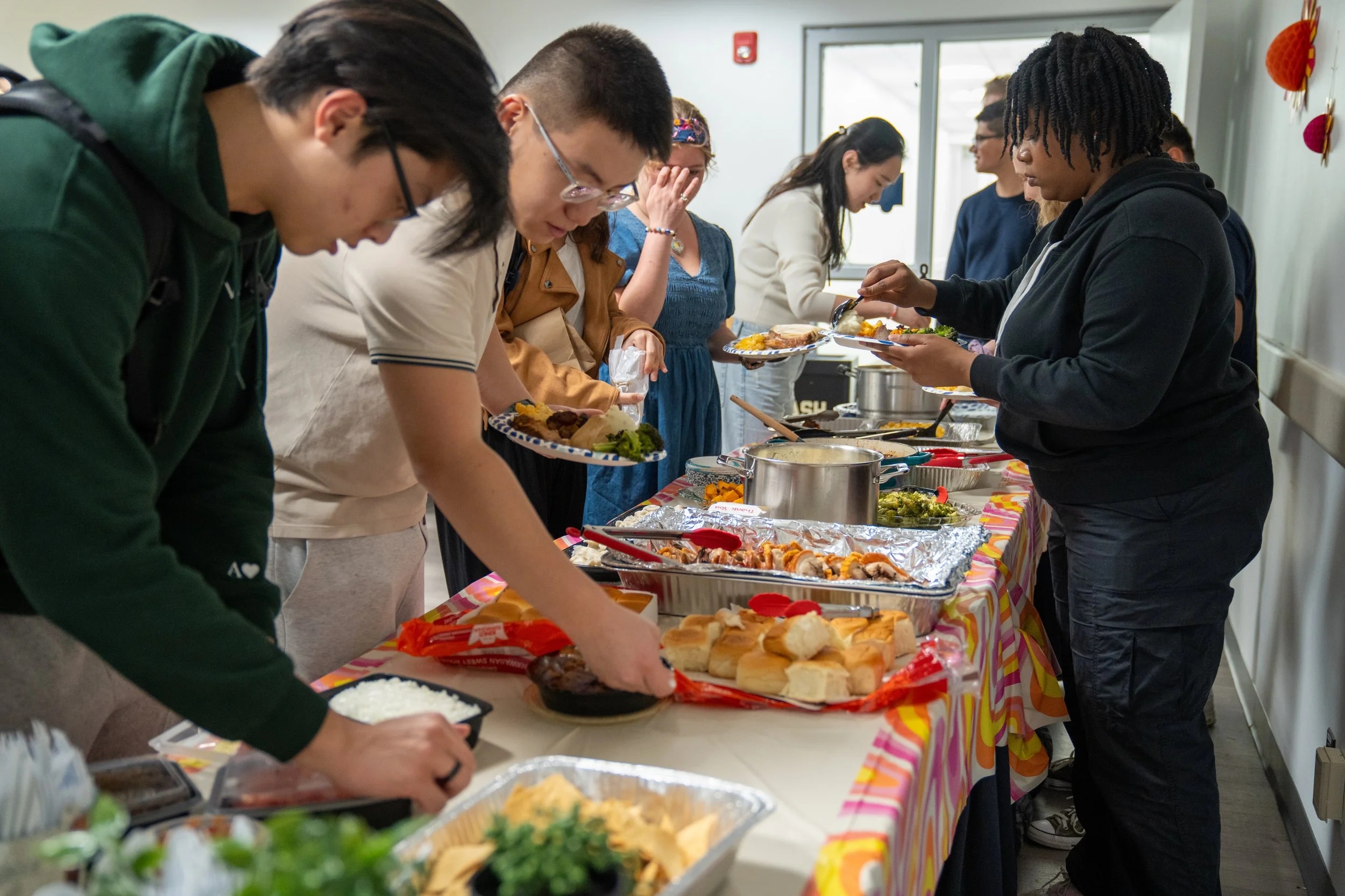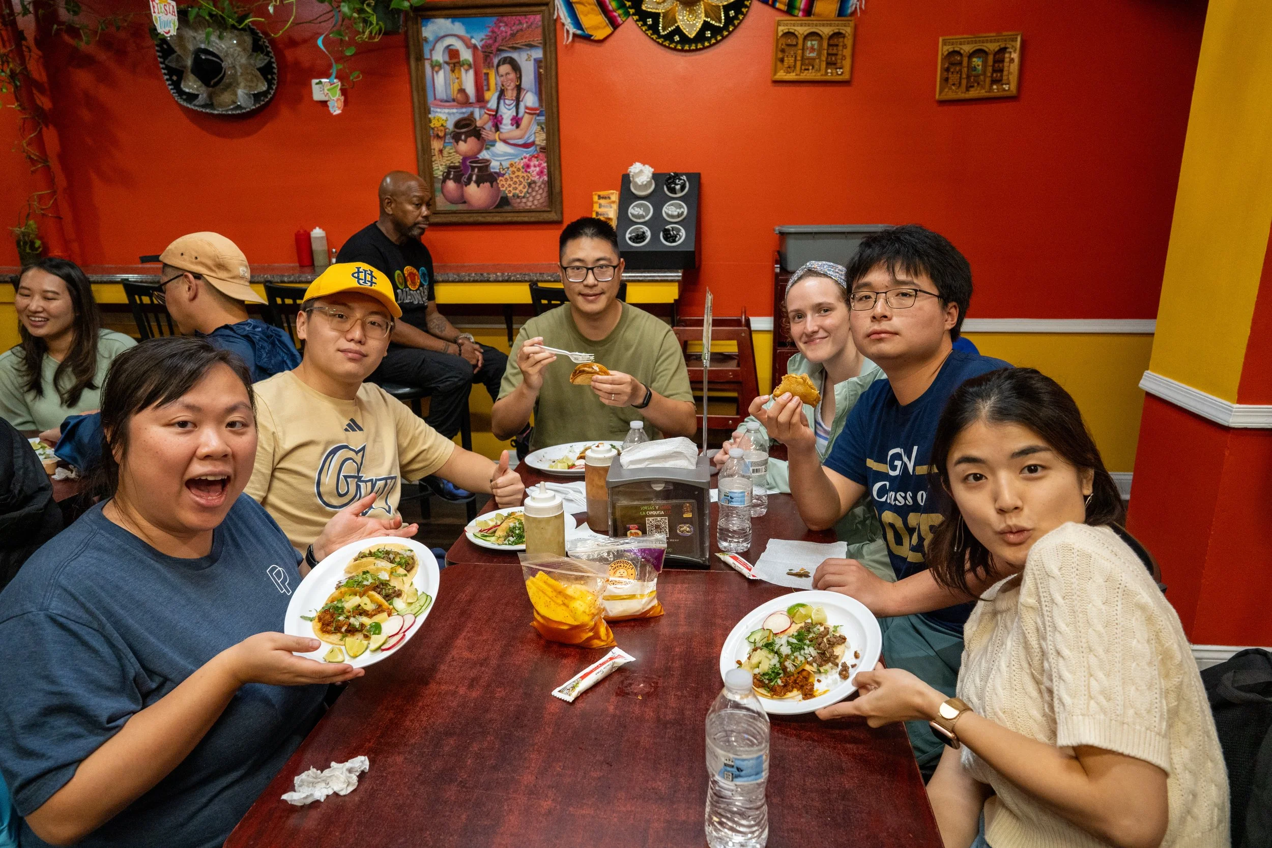 Group of seven young people sitting around a table in a lively restaurant, enjoying Mexican food with plates of tacos, salsa, and drinks. They are smiling, some holding plates, and others eating. The restaurant has colorful walls with Mexican-themed