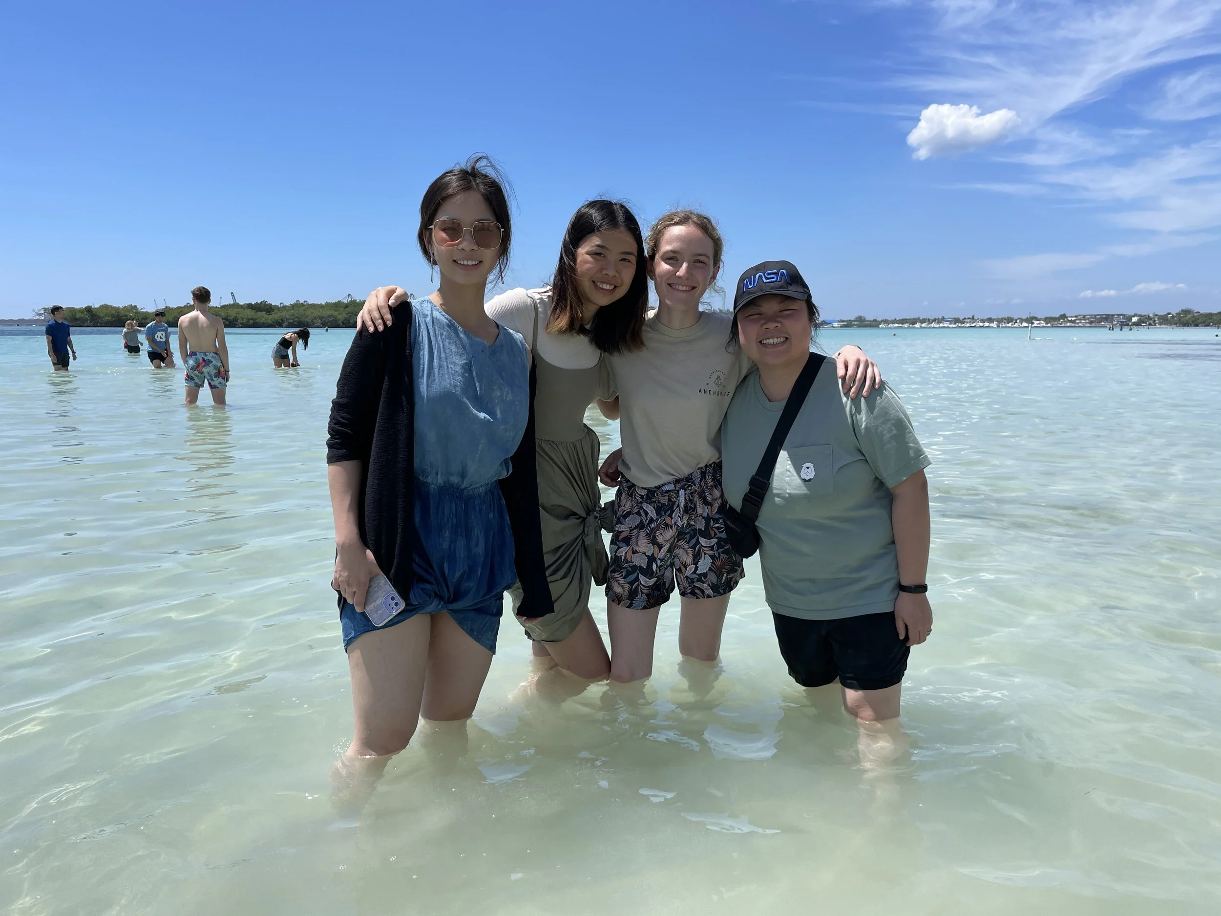 Four women standing together in shallow, clear water at the beach, smiling, with others in the background enjoying a sunny day.