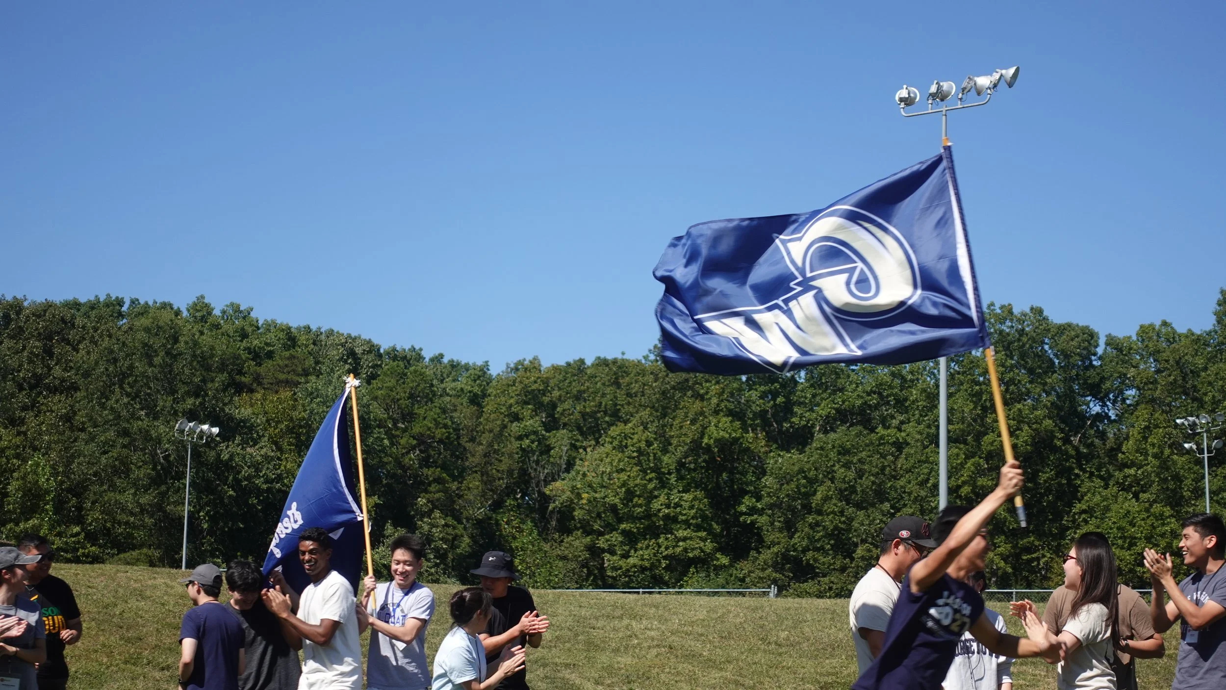 A group of people outdoors, some clapping and smiling, with a large blue flags featuring the Seattle Seahawks logo waving in the wind, on a grassy field with trees and floodlights in the background, under a clear blue sky.