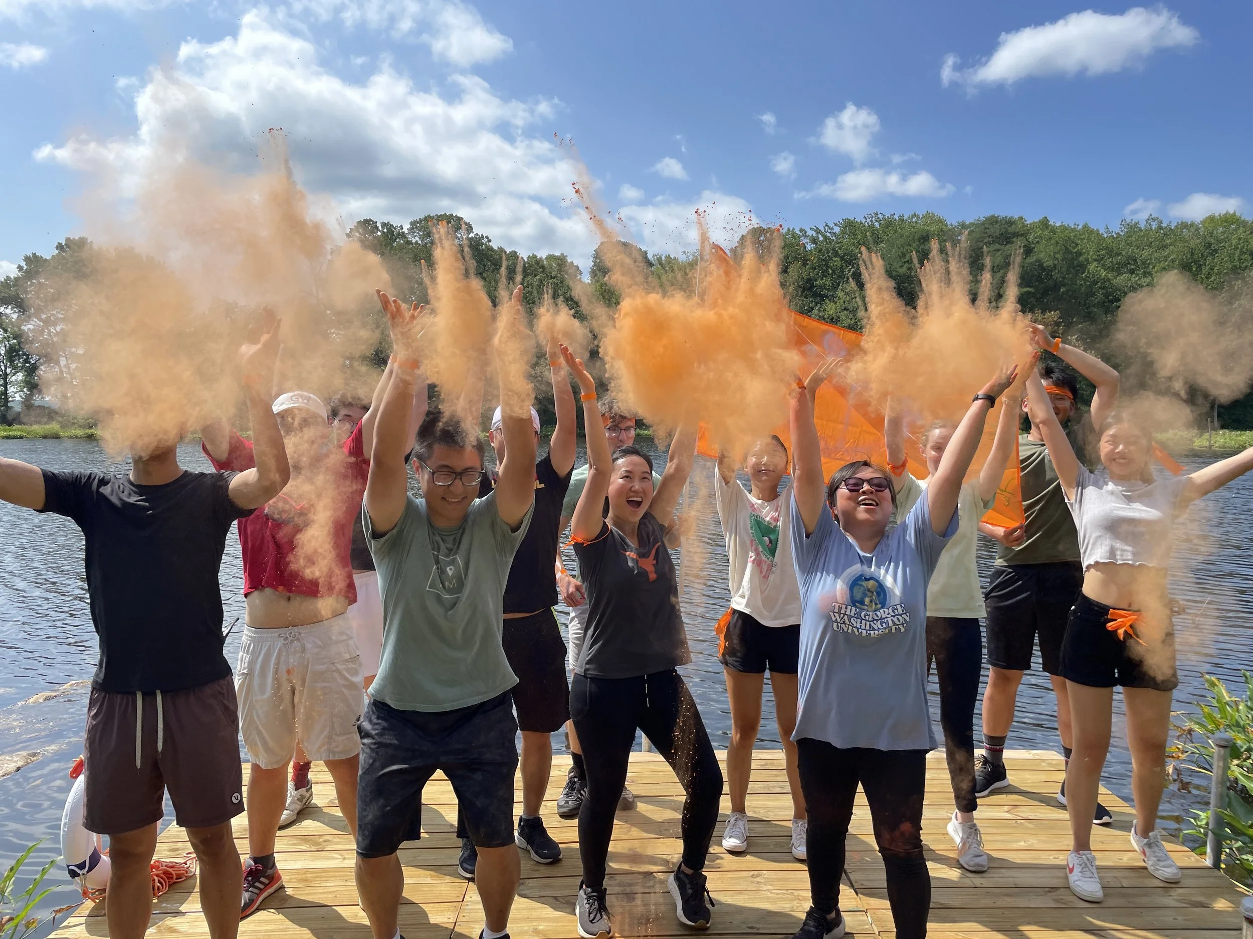 Group of young people outdoors celebrating, throwing orange powder in the air on a sunny day near a lake.