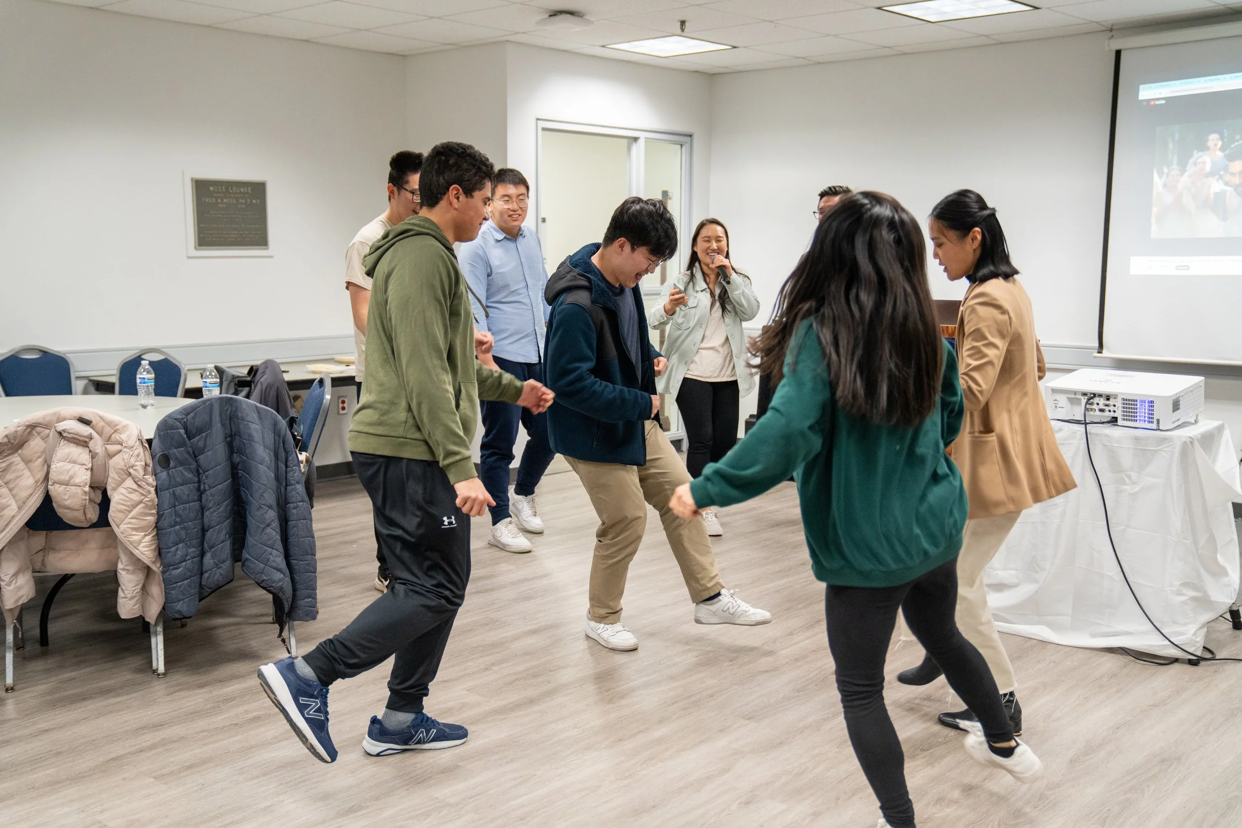 Group of people dancing and enjoying themselves in a conference room with a projected screen and a table with electronic equipment.