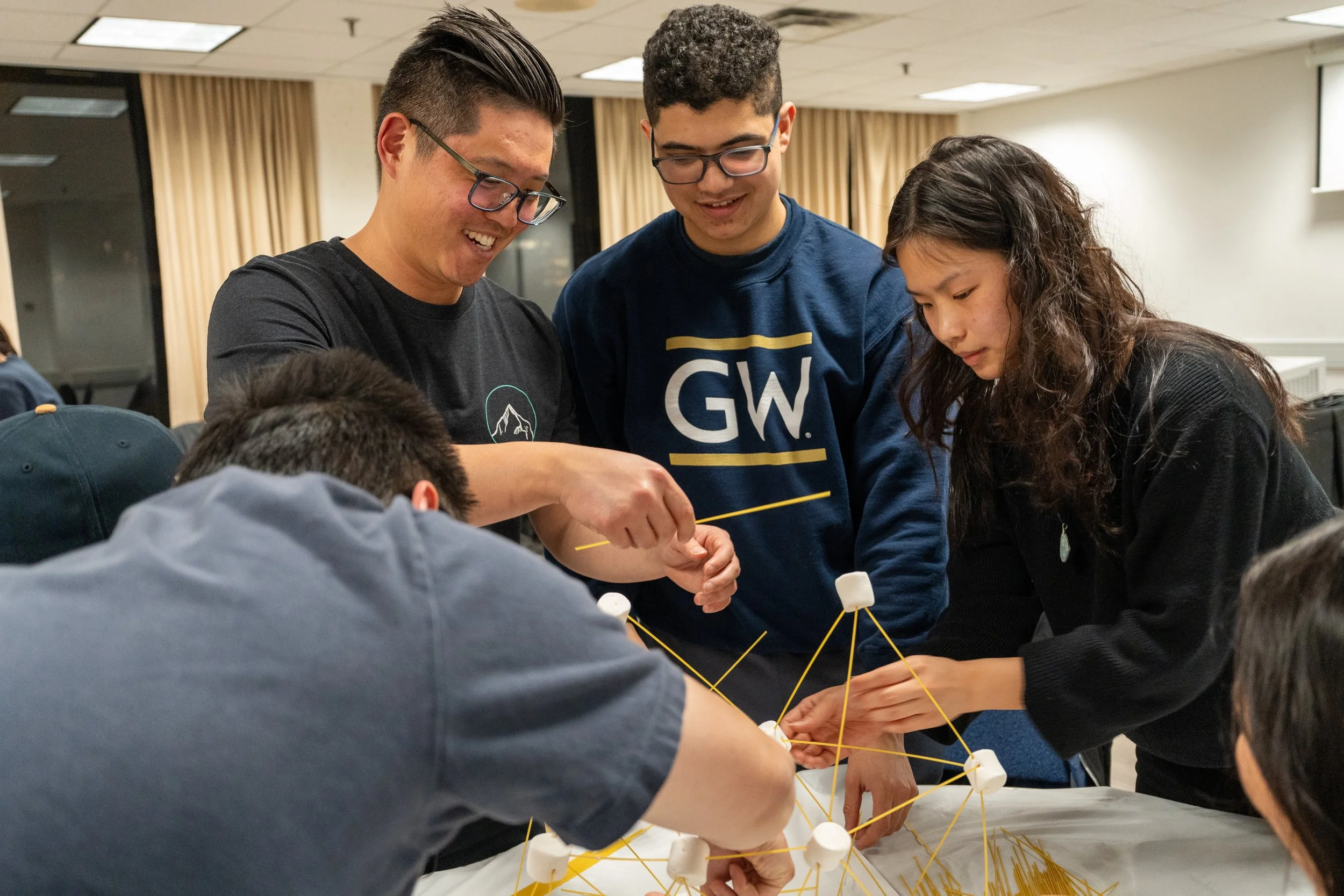 Two young adults are leaning over a table sorting colorful candies into clear plastic cups. A third young man stands in the background smiling. A large screen in the background displays 7:40.