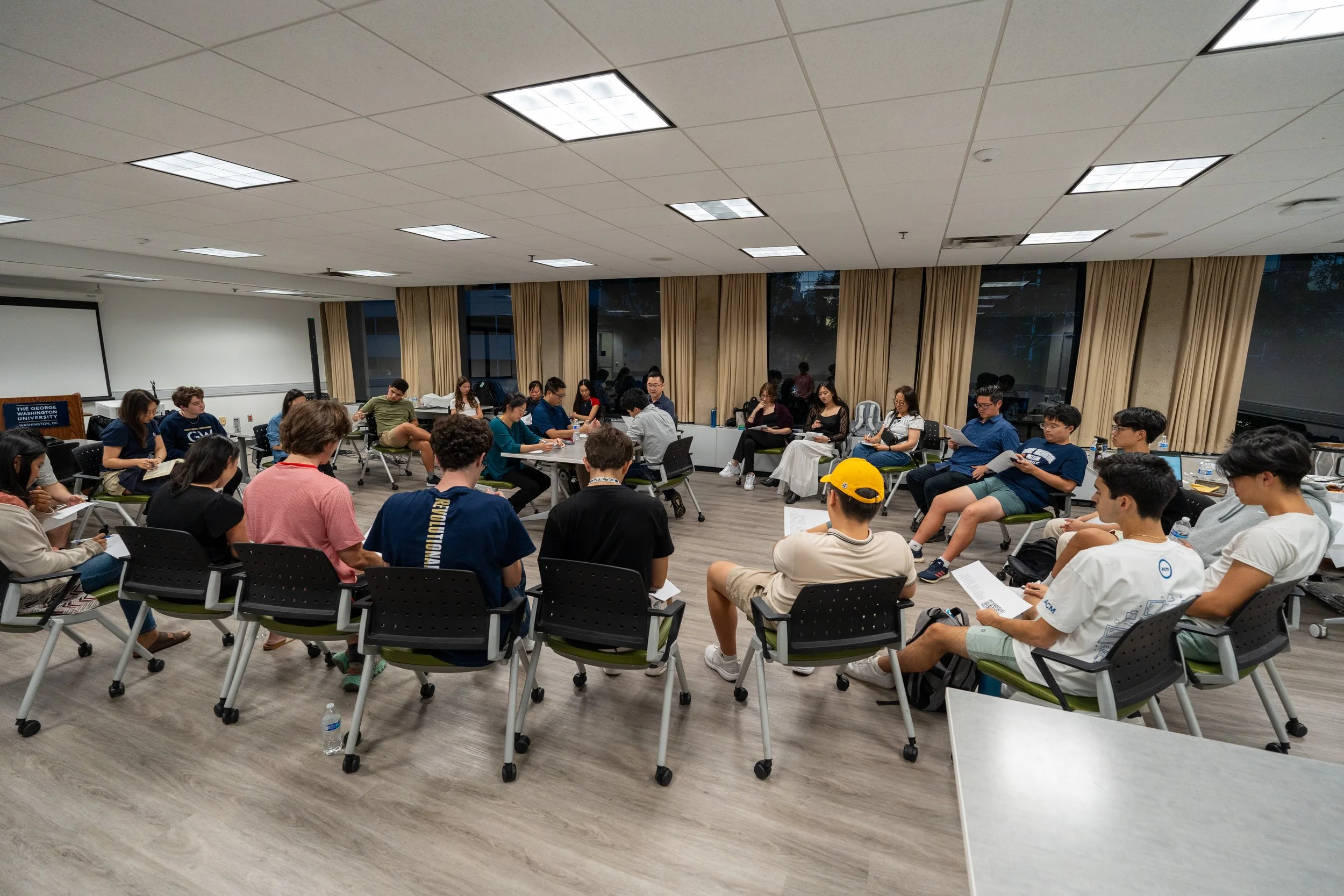 A group of people seated in a large, well-lit conference room, participating in a meeting or workshop, with some taking notes and engaging in discussion.