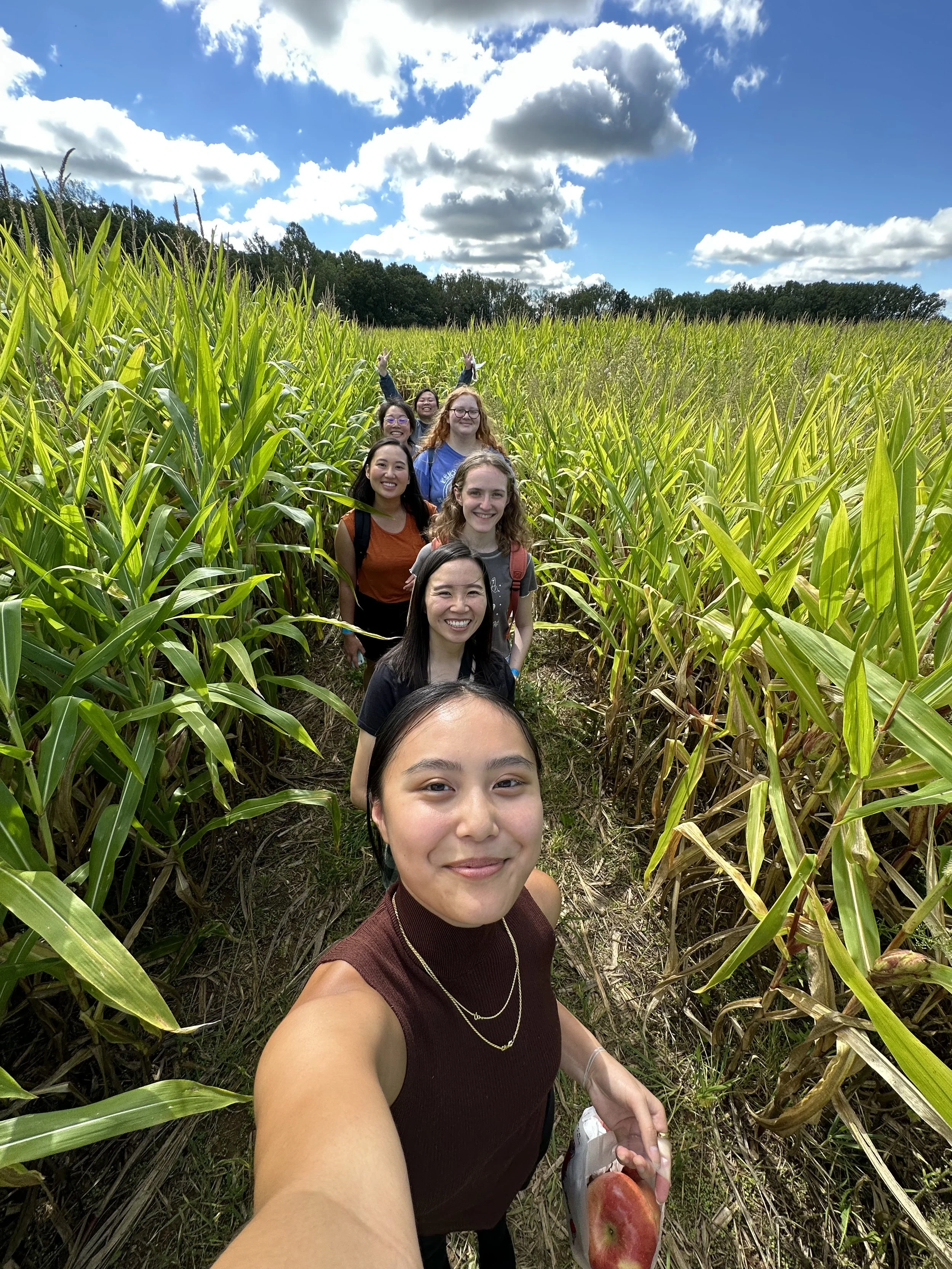 A group of eight young women walking through a green cornfield on a sunny day, taking a selfie.