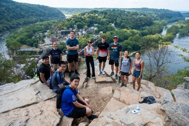 Group of nine young people on a rocky hilltop with a scenic river and green hills in the background.
