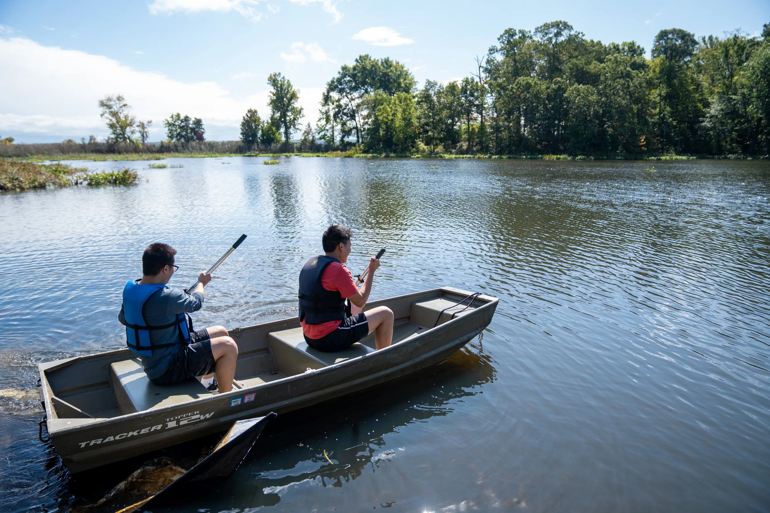 Two boys in life jackets fishing from a boat on a lake with trees in the background under a partly cloudy sky.
