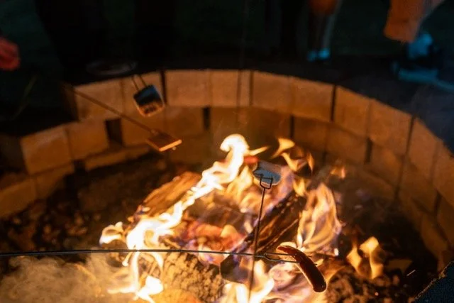 A fire pit with flames and burning logs surrounded by bricks, with some skewers or sticks inserted into the fire for roasting marshmallows or snacks, in a backyard setting at night.