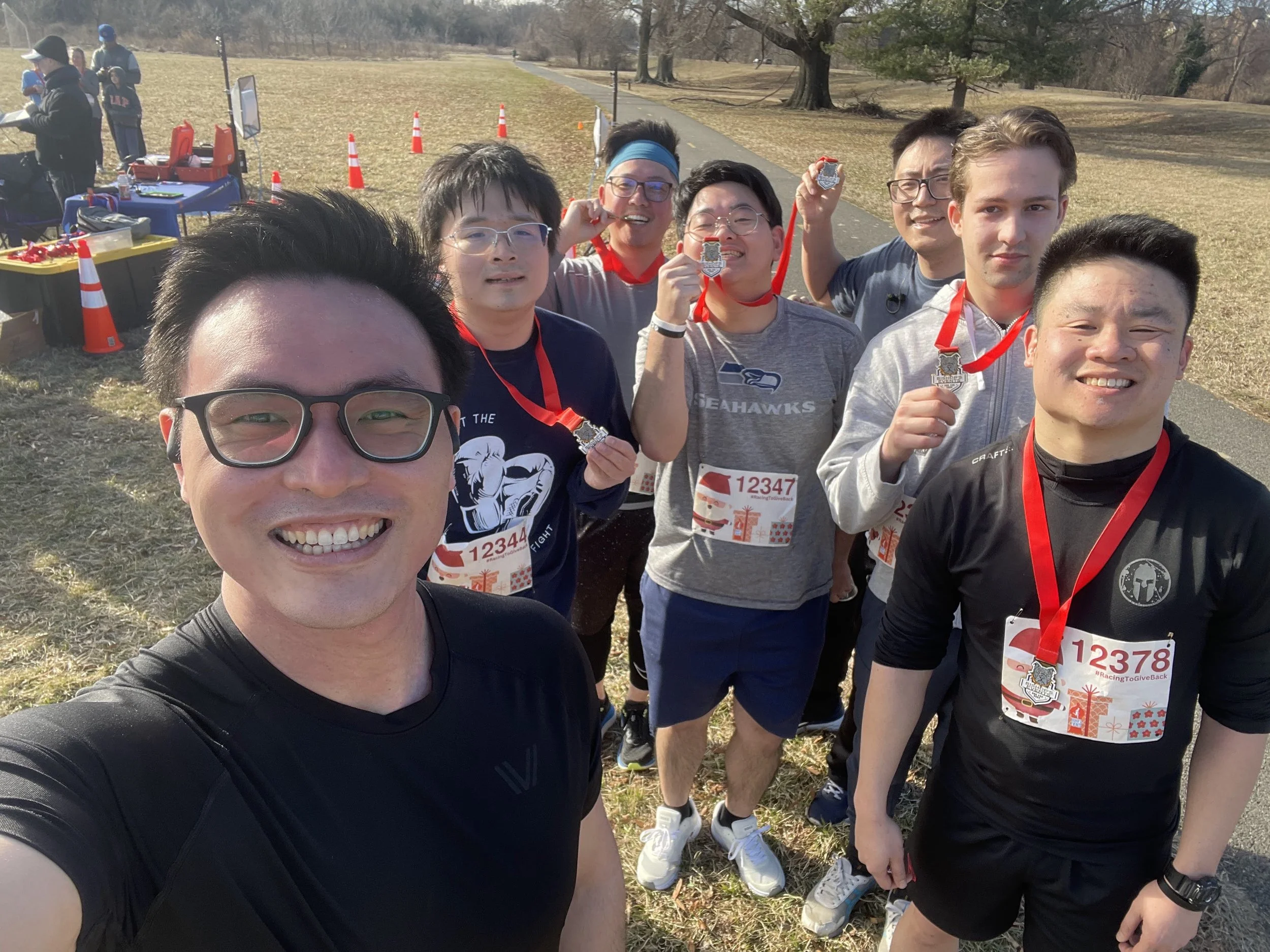 Group of smiling runners holding medals after completing a race in a park on a sunny day, with running bibs and refreshment stations in the background.